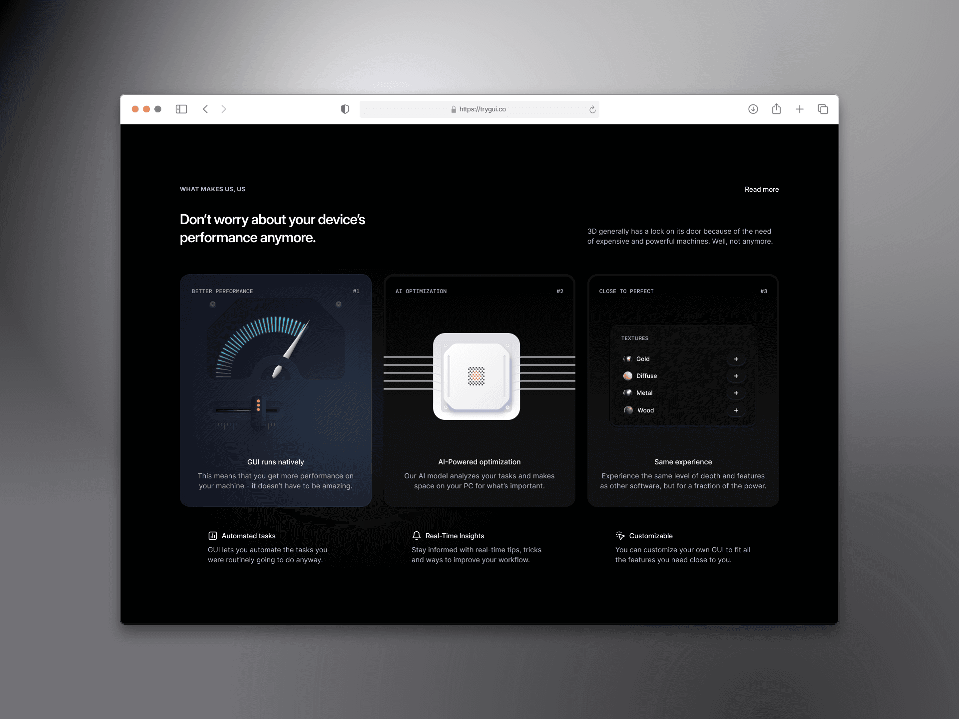 GUI gives its users a new way to make 3D art and designs. Long gone are the days of hundreds of hours of learning and research to create a simple 3D asset. The app is built to be accessible and so that everyone can pick it up, even if they have no prior experience in the 3D design field.